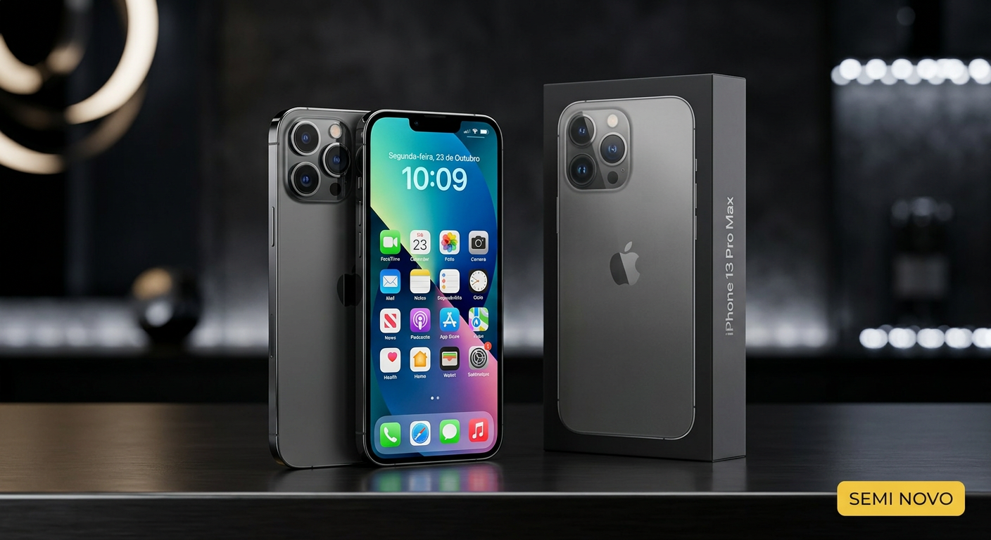 A Videira Araguari está realizando uma ação especial valendo um iPhone 13 Pro Max 128GB (semi novo), na cor preta.